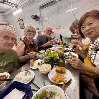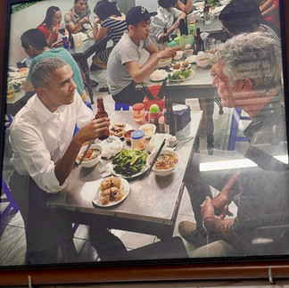 At this point, our heads were swimming with information and lineups, but we were in for a real taste-fest, the best food of our Asian adventure thus far. When Barack Obama visited Vietnam in 2016, he had lunch at a little unassuming and unknown cafe, Huong Lien, and now the cafe is famous. We arrived after the lunch hour but the cafe was still packed. Sing told us that at noon, the lineups string down the street. I believe we had the same meal and beer that President Obama had, and it was amazing. The restaurant and menu have not changed one bit - unassuming and cramped.