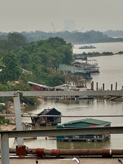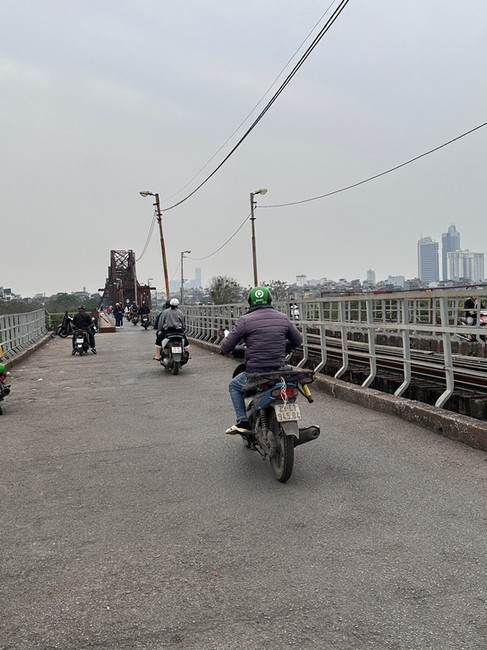 We stopped under the 2.4 kilometre Long Bien bridge which was built between 1899 and 1902 by two French architects and was once one of the longest bridges in Asia. It was important during the Vietnamese War as it was the only bridge connecting the main city of Hanoi and the port, so it was heavily bombed. It has now been converted to a motorcycle and bicycle-only bridge while a modern bridge sits in the distance. The bridge has two one-way lanes divided by a train track. The Long Bien bridge is a known site for wedding photos, sunsets and, I imagine, any manner of social media posts. To go with the history, Summi pointed out nude bathers in the river below and said this is a ‘thing to do’ on Banana Island.