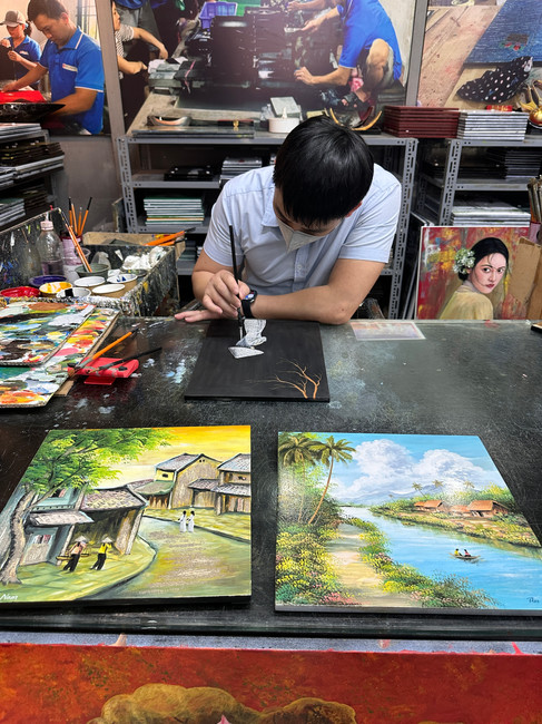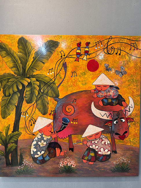 Next up was a bit of Vietnam artistic culture, the historic art of lacquerware which dates back some 2,000 years. We visited a studio/sales outlet where we learned how a surface is carefully prepped over several stages and then painted or painstakingly designed with tiny egg shells or silver or gold to create elaborate scenes which are then coated with lacquer tree sap into a hard picture or bowl. The results were beautiful, and if we would have had larger suitcases, we would have purchased a whimsical scene. A good article is “Southern lacquer villages struggle to survive” at en.vietnamplus.vn which talks about the history of lacquerware and the struggle of small rural villages to preserve their craft. Other historic crafts include pottery, silk and bamboo weaving, wood carving, and bronze work.
