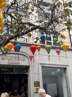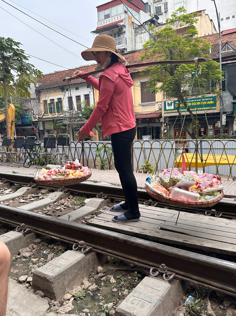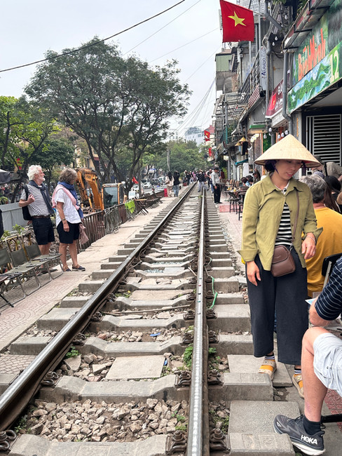 Our new young friends then took us for a real treat - Hanoi Train Street. Here, we sat on little chairs outside a cafe waiting for a train to pass right outside the cafes and shops. Similar to the train market in Bangkok (if you are interested, please see my blog “Our Asia Adventure 2026: Bangkok - let a private guide handle the chaos”), the train passes right through a residential and commercial area - but this train passes even closer. Right before the train passes, young fellows hustle people off the track and push them back far enough so their faces aren’t smooshed against the side of the train. They knew exactly how much space to give the train. It was still eery. To give you some idea, the street was closed to tourists for a period in 2019 because of too many ‘close calls’. It was reopened to tourists in 2023. Now, cafe workers appear to ‘monitor’ the track. You are expected to buy a drink if you want to sit in one of the chairs, and the young fellows will save you from probable harm. The original train track was built in 1902 for trains running north. In the residential area, locals visit and play games on the track until the train arrives.