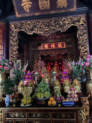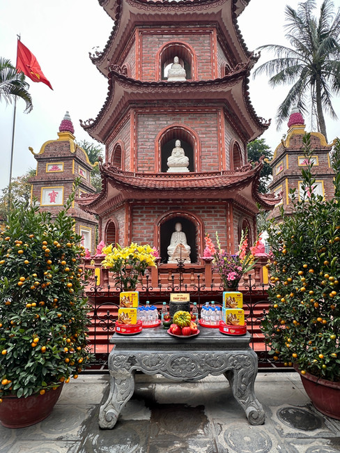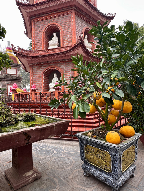 Our first early morning stop was the Tran Quac Pagoda, described as one of the unmissable sights in Hanoi. It is some 1,500 years old, the oldest in Hanoi. It sits beautifully on an ‘islet’ in Westlake. Its centrepiece is the 11 story stupa, or tower, each story made of six arched doorways holding a Buddha figure. Reading up, there is a difference between pagodas and temples. Pagodas are described as a place for spiritual peace and reflection while temples are more for worshiping or remembering ancient kings and local heros. A good explanation of the difference can be find at “Temples vs Pagodas: Spiritual Heart of Vietnamese Culture” at hanoifreeprivatetourguide.com. In Sing’s explanation, the difference between a Buddhist pagoda and a temple is that a pagoda is a place for everyone to ask for blessings for general wellbeing whereas a temple is a place for more specific requests such as wealth. This was a truly beautiful site with endless photo angles.