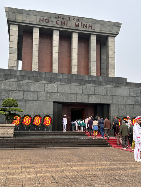 Sing then escorted us to the most important site for the Vietnamese, the Ho Chi Minh Memorial in Ba Dinh Square. Ho Chi Minh is seen as the father of Vietnam, their most influential leader who facilitated revolution and liberation. Again, there is much on line if you want to know more about Ho Chi Minh. He certainly has an interesting background with, of course, some who dispute his accomplishments and/or methods. The memorial has limited opening days and hours so I imagine lineups are a given. But what a lineup! In addition to locals and tourists and a string of ‘important people’, there were hundreds (thousands?) of elementary-aged school children lining up to see the embalmed body of Ho Chi Minh. Although we found it strange to parade school children before a dead body, Sing explained that this was seen as almost a rite of passage. Children are taught from a young age that Ho Chi Minh was the most important figure in Vietnamese history, so to visit his body was an anticipated honour. They were bouncing up and down and waving and giving us “high-fives”; one gave us the ‘thumbs up’ when we said we were from Canada. Of course, no pictures were allowed of the embalmed body of Ho Chi Minh.