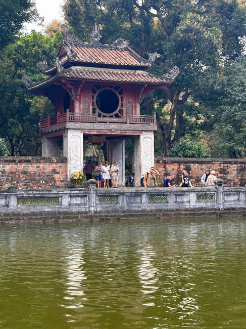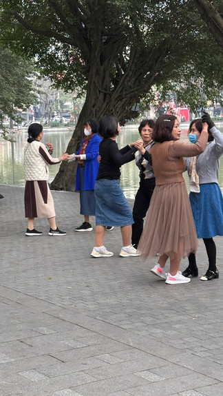 In the early morning of our first day, we strolled around the nearby lake, Hoan Kiem Lake, which seemed to be a time for the ladies as we saw many having tea together or practicing tai chi by the lake. The Ngoc Son Temple, reached by the stunning red Huc Bridge or “Place of Morning Sunlight” on an ‘islet’, is a sight. In the early morning, the lake walk was tranquil, but when we returned on a Sunday afternoon, the lakeside path was packed with local families. Here’s some calm early morning vibes before the rush begins.